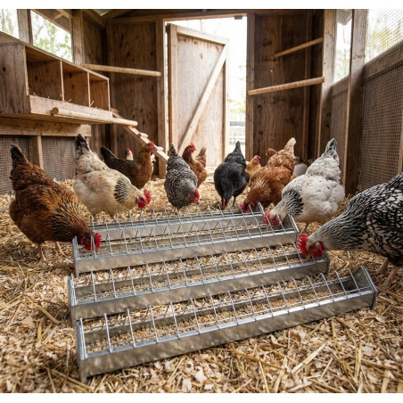 Comedero de metal para Pollos y Gallinas con rejilla de 100 cm de ancho. Comedero de rejilla ancha para gallinas y pollos. Medidas: ancho 100 cm, fondo 10 cm, alto 13 cm. Comedero metálico fabricado en España. Pack de 4 unidades.