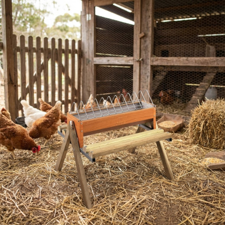 Comedero para gallinas fabricado en madera de alta calidad.
