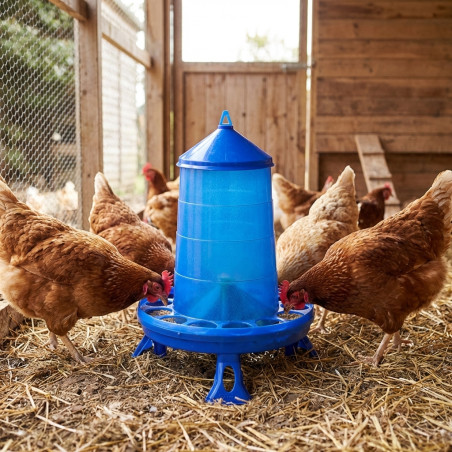 Tolvas de plástico para gallinas y otras aves. Elaboradas con plástico de gran resistencia permiten que sean ligeras y se puedan adaptar para cualquier tipo de necesidad ya sea colgantes o con patas para ubicarlas directamente en terreno. El depósito de forma troncocónica, evita que el pienso se apelmace y pueda caer regularmente al plato. El plato de considerable altura y bordoneado hacia el interior dispone de arillo anti-desperdicio, impidiendo que las aves puedan tirar y malgastar el pienso. La tapa nos ayuda a evitar que entre cualquier suciedad en el interior del depósito, a la vez que conservar el pienso en buen estado. El asa de varilla galvanizada, permite que se pueda suspender y colgarla con el cordón suministrado fijas a la altura que se crea conveniente.