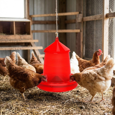 Tolvas de plástico para gallinas y otras aves elaboradas con plástico de gran resistencia permiten que sean ligeras y se puedan adaptar para cualquier tipo de necesidad ya sea colgantes o con patas para ubicarlas directamente en terreno. El depósito de forma troncocónica, evita que el pienso se apelmace y pueda caer regularmente al plato. El plato de considerable altura y bordoneado hacia el interior dispone de arillo anti-desperdicio, impidiendo que las aves puedan tirar y malgastar el pienso. La tapa nos ayuda a evitar que entre cualquier suciedad en el interior del depósito, a la vez que conservar el pienso en buen estado. El asa de varilla galvanizada, permite que se pueda suspender y colgarla con el cordón suministrado fijas a la altura que se crea conveniente.