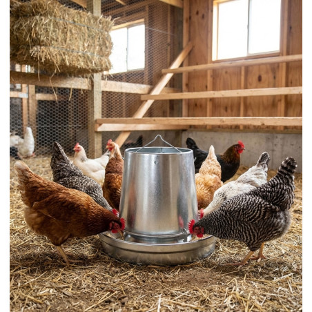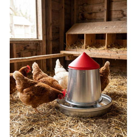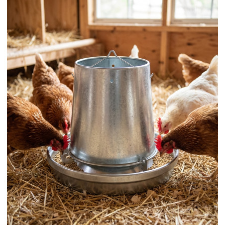 Tolva metálicas para gallinas fabricada en chapa galvanizada. Su resistencia permite un uso extensivo y de larga útil ya que son resistentes a la corrosión, a los impactos propios de su manipulación y la calidad de sus acabados plegados sin filos para evitar cualquier tipo de lesión para el granjero como para las animales. Su diseño permite que su cono deposito y su plato sean totalmente ampliables favoreciendo su transporte y almacenaje, al igual que pueden colgarse colocarse directamente en el suelo gracias a sus patas.