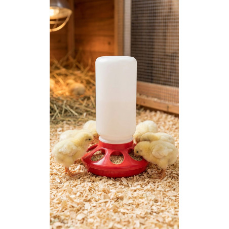 Comedero para proporcionar alimento a pollitos de primera edad. Elaborado en plástico translúcido de alta resistencia, para comprobar el nivel del pienso. Capacidad de 1,5 litros. Fabricado en dos piezas desmontables (Plato y Cono) para fácil limpieza y cómodo llenado. Antiposado, para evitar que ensucien el agua.