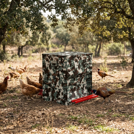 Una de las características más destacadas de esta versión específica es su Acabado de Camuflaje. Este revestimiento especializado no solo protege la estructura metálica de la corrosión, sino que también integra el comedero de forma discreta en el entorno natural o del corral, proporcionando una barrera visual que puede disuadir a ciertas plagas o fauna silvestre no deseada, manteniendo el alimento exclusivamente para sus aves destinadas.