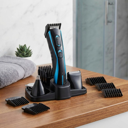 Perfecta combinación 5 en 1, ideal para el cuidado personal. Con dos cabezales diferentes: El cabezal de lámina en U con peine de 5,6,7,8 mm. El cabezal de lámina en T con 4 peines: 3,6,9,12 mm. Cortador-afeitador de barba, recortador para nariz y orejas, cortador de patillas. Autonomía de 45 minutos. Elegante diseño. Inalámbrico. Con longitud de corte ajustable. Incluye base.