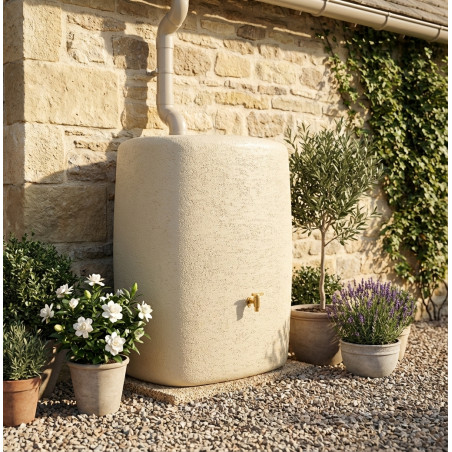 Depósito de agua de lluvia Terra. Depósito decorativo de 275 litros con dimensiones de 40x80x105 cm en color beige. Ideal para almacenar agua de lluvia de forma estética y funcional en tu jardín.