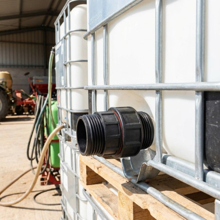 Adaptador universal diseñado para depósitos tipo jaula de 1.000 litros. Medidas disponibles: 1. Fabricado en polietileno en España. Suministrado con junta para garantizar su estanqueidad.