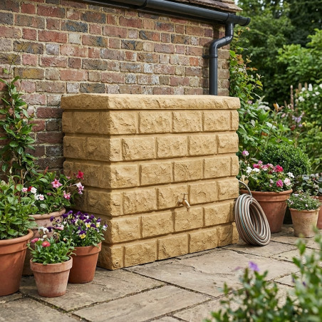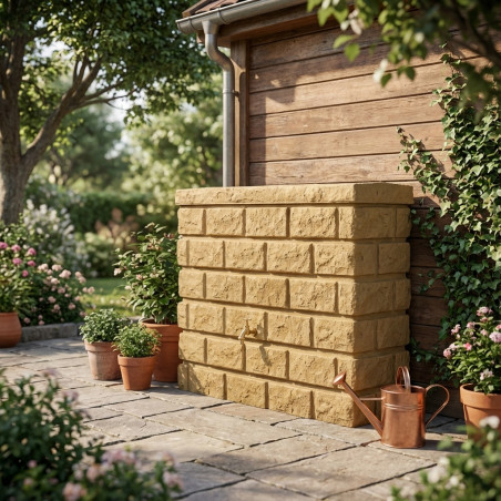 Depósito recuperador de lluvia decorativo en imitación de piedra auténtica con aspecto de piedra natural y superficie mate de alta calidad. Cada depósito es único, con diseño y superficie excepcionales. Incluye una abertura en la parte inferior para el vaciado antes del periodo de heladas y grifo para una extracción de agua sencilla. Peso en vacío de 35 Kg.
