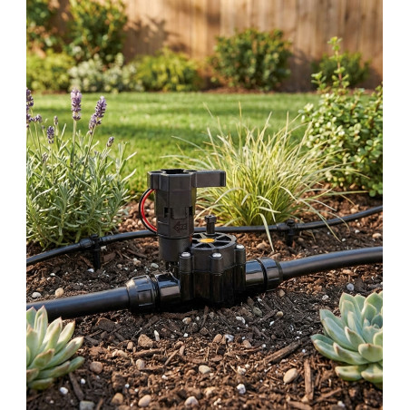 Electroválvula de riego 3/4 9V LFV bajo caudal Rain Bird, uso con programadores a bateria 9V Es la única electroválvula del mercado diseñada específicamente para sistemas de riego localizado, siendo por lo tanto la única electroválvula que permite trabajar con caudales muy bajos (45,4 a 1.136 litros/hora) Esta válvula presenta todas las características de fiabilidad de las electroválvulas Rain Bird Dv, junto con una membrana única diseñada para permitir que las partículas atraviesen la válvula en caudales extremadamente bajos, previniendo por lo tanto fugas. Facilidad de mantenimiento - Tornillo de purgado externo para purgar el sistema manualmente y eliminar suciedad durante la instalación y puesta en marcha del sistema. - Apertura manual sin fugas de agua. Fiabilidad - Membrana de doble junta única, con un asiento de la membrana de ½” de diámetro para un funcionamiento perfecto con caudales bajos. - Doble filtración al nivel de la membrana y del asiento del solenoide para máxima fiabilidad. Especificaciones: Caudal: 45,42 a 1.136 litros/hora. Presión: 1,0 a 10,3 bares. Especificaciones eléctricas: Solenoide 24 vAC 50/60 Hz. Corriente de arranque: 0,30 (7,2 VA). Corriente de régimen : 0,19 (4,56 VA). Altura: 11,4 cm Longitud : 10,7 cm Ancho: 8,4 cm. Marca Rain Bird. Funciona con programadores eléctricos de cualquier marca del mercado.