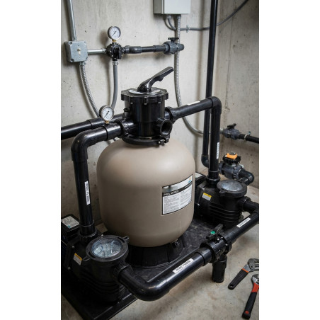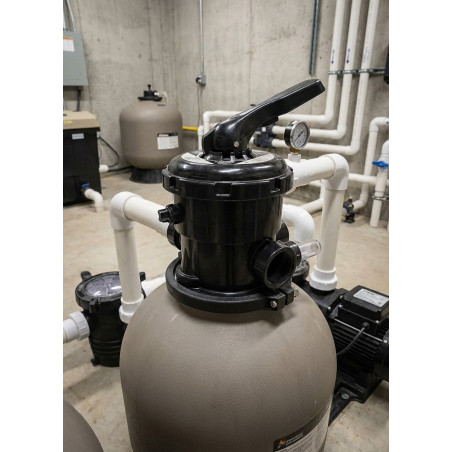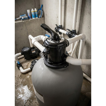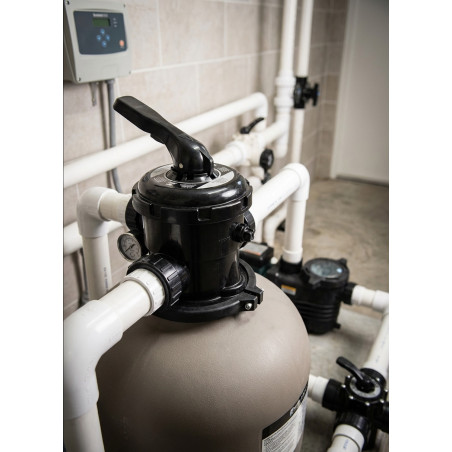 Esta válvula selectora cuenta con seis vías de funcionamiento para diversas tareas de mantenimiento de la piscina.