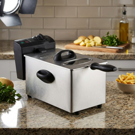 Potente freidora eléctrica de 2000W con capacidad de 2,5 litros, hará que cocinar sea sencillo. Con carcasa realizada en acero inoxidable pulido y el recipiente interior es esmaltado. Controla el proceso de fritura gracias a su tapa con ventana. Ofrece doble termostato con control de temperatura hasta 190ºC y luz indicadora de temperatura. Incluye cesta, con asa fría al tacto. Los pies son antideslizantes para evitar el moviminento de la freidora.
