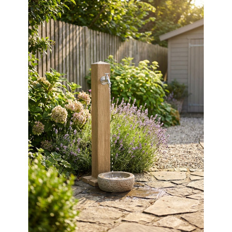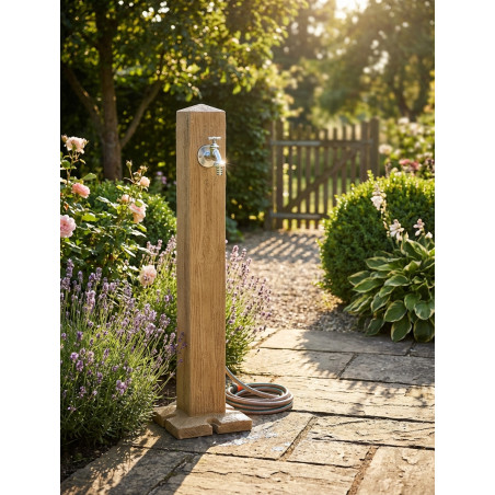 Diseño efecto madera natural, que combina estética decorativa con funcionalidad, ideal para quienes buscan un punto de agua práctico sin renunciar a la armonía visual del espacio exterior.