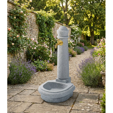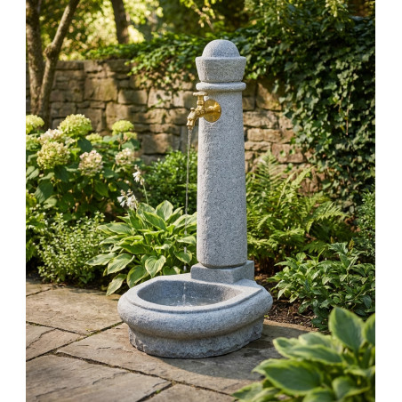 Fuente de agua decorativa para exterior, perfecta como punto de agua ornamental o funcional en zonas ajardinadas, patios y áreas de descanso. Conexión con manguera de 19mm.