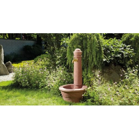 Fuente de jardin piedra Roma rojizo con superficie imitación muy realista a piedra. Incluye grifo antiguo 19 mm (3/4“) para la extracción fácil del agua. Conexión por debajo manguera 19 mm (3/4“). Altura 1 metro, Ancho 54 cm y Fondo 58 cm. Peso 8 Kg.