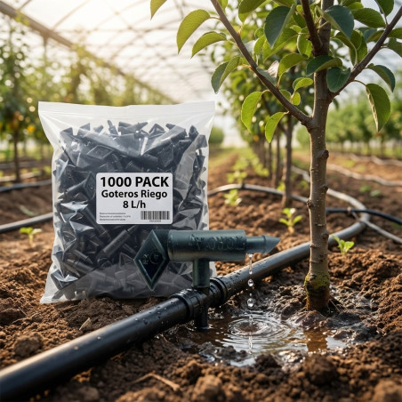 El caudal de los goteros es de 8 litros/hora, ideal para diversas aplicaciones de riego.