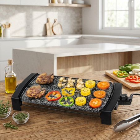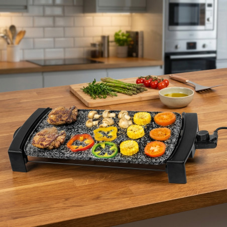 Para una dieta sana y saludable, esta es la plancha ideal, ya que su placa es de aluminio fundido con revesitmiento de granito, permite cocinar cualquier alimento sin grasas. Su tamaño de 45x25cm la hace ideal para cualquier cocina. El termostato es regulabe 80ºC hasta 230ºC para poder controlar la cocción de cualquier alimento que se vaya a cocinar. Su limpieza es sencilla y dispone de una bandeja recoge grasas y termostato desmontable. Sus asas, que facilitan su transporte, son frías al tacto para evitar quemaduras y los pies antidelizantes, evitaran el movimiento durante la elaboración de la comida. Su potencia es de 1820-2150W.
