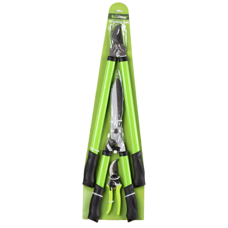 El set incluye tijeras para diferentes diámetros. La tijera de 61cm es ideal para ramas más gruesas y leñosas, mientras que la de 20cm se enfoca en ramas más finas y delicadas. La tijera de 53cm está optimizada para el corte de setos y cercas vivas.