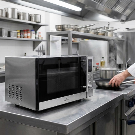 Microondas Profesional con Plato Giratorio, Color Plateado Capacidad de 25 litros, Potencia 900 W. Fabricado en acero inoxidable de alta calidad, este horno microondas ofrece un moderno control electrónico para ajustar los distintos parámetros del cocinado, como la selección de potencia, tiempo, grill, descongelado, comienzo rápido y programación horaria. Además, permite configurar un horneado multisección y cuenta con un plato giratorio de 27 cm e incorpora un soporte grill.