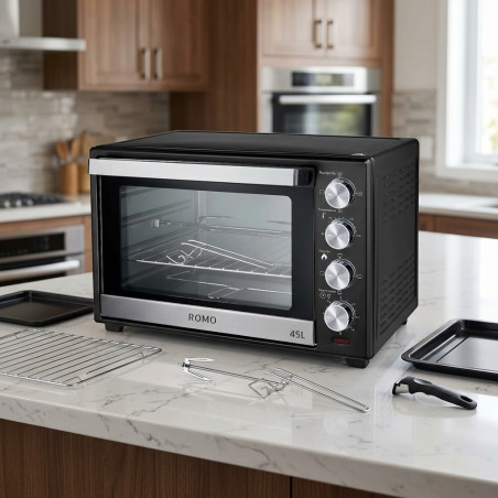 Este horno eléctrico de sobremesa con convección reparte el calor de forma homogénea, logrando resultados tiernos y sabrosos. Equipado con luz interior para controlar la cocción. Con 2000W de potencia y 45 litros de capacidad, este horno ofrece versatilidad y resistencia. Color negro.