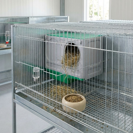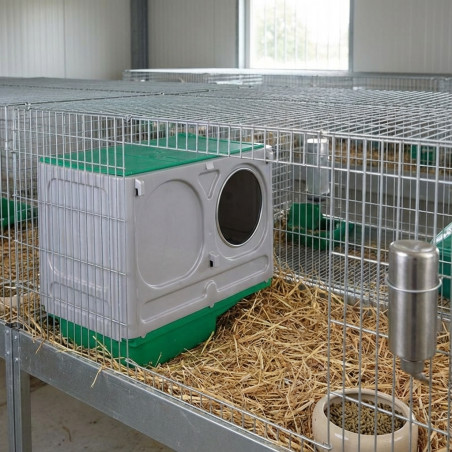 Nido adaptable a cualquier jaula de conejos Suinga. Fabricado con termo-plástico muy resistente. Diámetro entrada 140mm. Anti-roído con protección de acero inoxidable. Producto con 1 año de garantía.