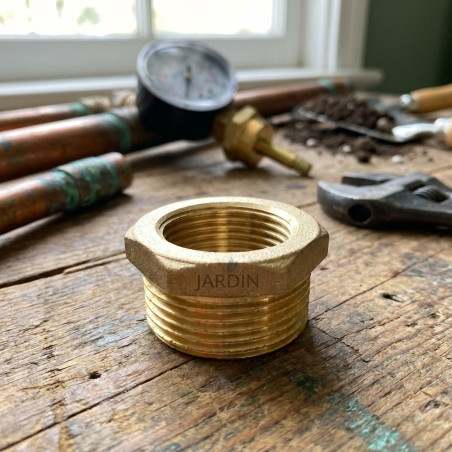 Tuerca reducida M-H de latón. Utilizada para roscar manómetros a la red de riego 1/2. Máxima calidad. Para fontanería y jardinería. Medidas macho 1/2, hembra 1/4.