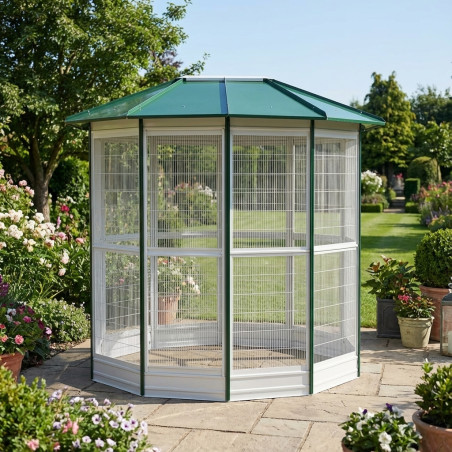 Jaula Pajarera de alta calidad para loros y pájaros. Formato de 10 lados con un tamaño total 294 x 155 cm. Techo color verde. Fabricado en España.