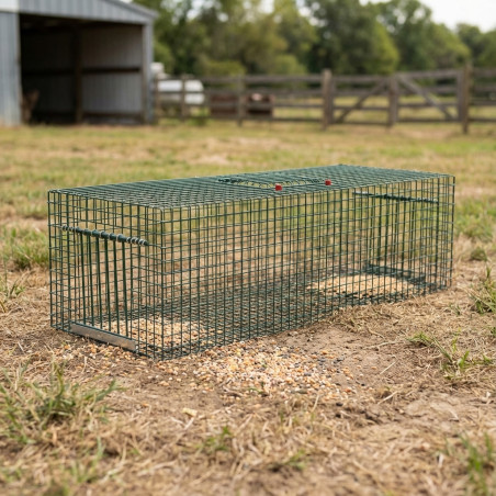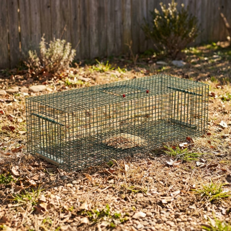 Jaula funcional metálica con 2 puertas para atrapar aves sin causar daños. Fabricado en alambre electro soldado y pintada en verde. Diseñada con dos puertas de acceso. Puertas diseñadas con basculación solamente hacia el interior del departamento, quedando atrapada dentro de la jaula. Puerta superior, para depositar comida o bien para ir sacando las palomas capturadas.