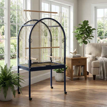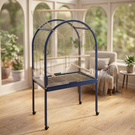 Jaula para loros, dotada con comederos, bebederos y palos. Bandeja y rejilla inferior extraible, puerta superior y ruedas con freno. De forma curva.