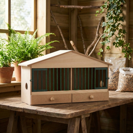 Jaula de madera de dos departamentos, con puertas frontales. Medidas 76,5 x 26 x 39,5 cm.