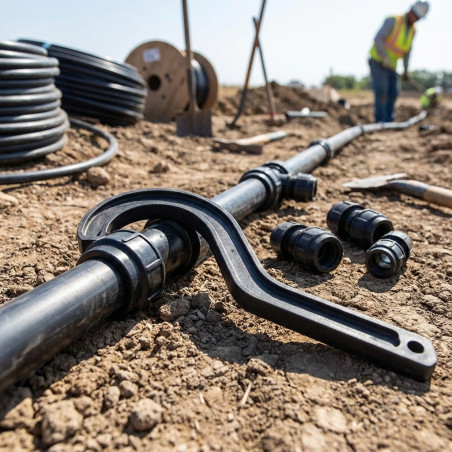 La llave de apriete de polietileno se utiliza para apretar la conexión de piezas de polietileno en trabajos de obra civil y en instalaciones de riego.