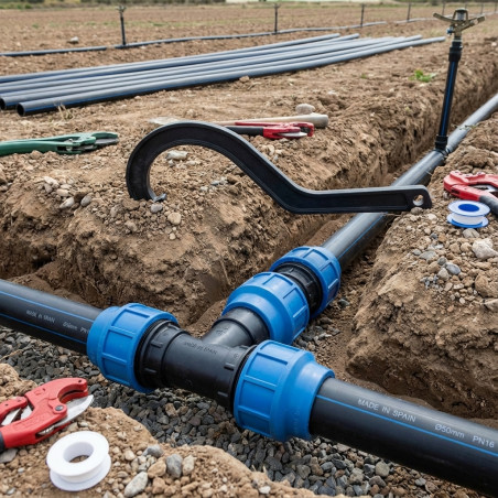 Llave de apriete de polietileno para apretar la conexión de piezas de polietileno es una herramienta indispensable para trabajos en obra civil e instalaciones de riego. Disponible en 2 medidas diferentes, esta llave de alta calidad fabricada en España es versátil y puede utilizarse con tuberías de alta y baja densidad. Además, se sirve en color negro, rojo o azul, de forma aleatoria.