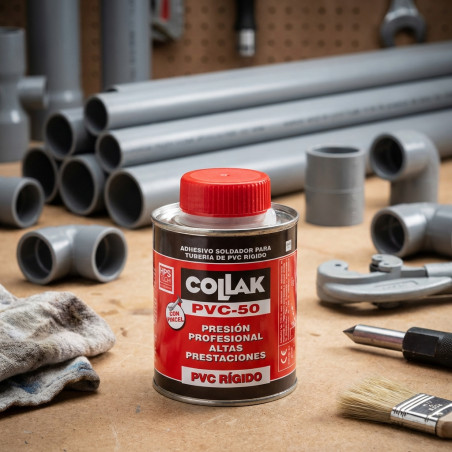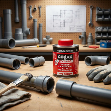 Adhesivo de gran facilidad de aplicación que proporciona uniones fuertes y resistentes al ataque de productos agresivos y al envejecimiento. Cumple las normas UNE-EN 14814 y UNE-UN 14680. Es un adhesivo soldador para la unión de tuberías y materiales de PVC rígido, de especial interés para los sistemas de PRESIÓN. Limpiar y desengrasar las superficies a encolar. Aplíquese una capa delgada y uniforme de adhesivo al manguito y luego una capa más gruesa al extremo del tubo previamente biselado. Efectuar la unión seguidamente sin giro alguno. Eliminar con un trapo el adhesivo sobrante. La encoladura no debe someterse a esfuerzos o movimientos antes de los 10 primeros minutos. Según la temperatura ambiental y la aireación de la unión, el fraguado del adhesivo tiene lugar aproximadamente a las 4 horas desde su aplicación. En instalaciones que deban soportar presiones superiores a 1,5 atm, esperar como mínimo 24 horas antes de ponerlas en servicio. La resistencia de la encoladura puede estimarse hasta rotura del material y no de la unión. Es un producto INFLAMABLE. Por ello deberá disponerse de una buena ventilación en los lugares de trabajo y evitar toda posibilidad de chispa o fuego. Para más información consultar la Ficha de Seguridad.