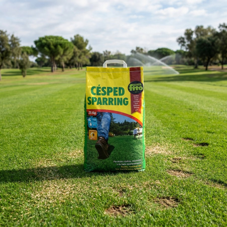 Semillas césped Sparring 25 Kg compacto resistente: Césped de amplio espectro, fuerte, estético y de rápida instalación en el terreno. Mantenimiento medio bajo en escarificados, pinchados, siega y fungicidas. Este césped es tolerante al color, sequía y salinidad. Ahorra un 30% de agua respedo a céspedes tradicionales. Usos: Campos de fútbol, hípica, rough de campos de golf, calles de pitch putt, jardinería de bajo mantenimiento y máxima rusticidad. Capacidad envase 25 Kg.