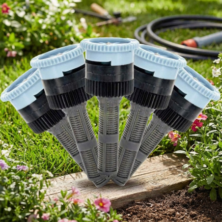 Boquilla ajustable tobera 6A Hunter para difusores de riego es un pack económico de 5 unidades de boquillas totalmente ajustables, con un radio de alcance de 1,80 mts. Estas boquillas ofrecen un riego uniforme y son compatibles con difusores de marcas como Rain Bird, Hunter, Suinga, Irritrol, Signature y Orbit. La presión recomendada de funcionamiento es de 1 a 2,1 bares.