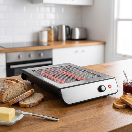 Tostadora eléctrica horizontal, Potencia 600, Color gris: Dispone de un temporizador para elegir el tostado al gusto del usuario. Incluye un selector de nivel (6 posiciones) de tostado a parte del temporizador para obtener un tostado óptimo. Potencia: 600 W. Fácil limpieza. Dimensiones máquina: 42x30x9cm. Dimensiones parrilla: 25x20cm.