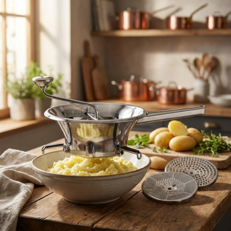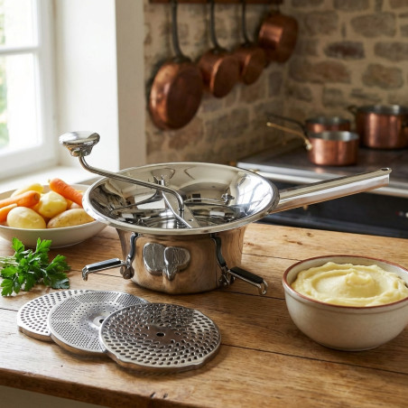 Este pasapurés está fabricado en acero inoxidable 18/10 (aleación con 18% de cromo y 10% de níquel, que ofrece un alto nivel de calidad y resistencia superior al acero convencional). Ofrece una excelente resistencia a la corrosión y a los ácidos alimentarios y sales; es un material liso, no poroso y muy higiénico, fácil de limpiar, y no transmite sabores extraños a los alimentos. Los pasapurés con varios discos, además, permiten variar el grosor y, por tanto, la textura del puré. Los más exquisitos conseguirán texturas todavía más finas, suaves y delicadas en algunas preparaciones si después de procesar los alimentos en el pasapurés los cuelan a través de un chino.
