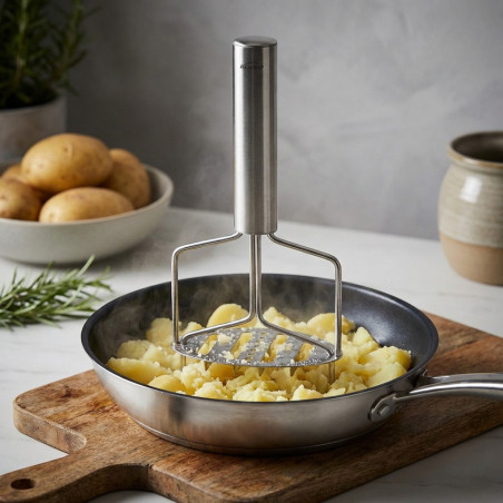 Este prensador de patatas está fabricado en acero inoxidable de alta calidad.
