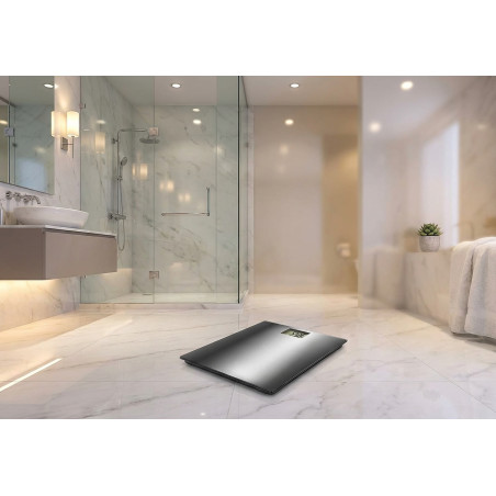 Bascula de baño con peso máximo de 180 kg, graduación 100 gr, 31x31x4 cm. Tecnología sin pilas ni baterías: se carga pulsando el botón central, con sistema EcoMove que convierte la energía cinética (energía en movimiento) en energía eléctrica. Fabricado en cristal extraplano templado de 5 mm de grosor y acabado con efecto mármol. Medición de alta precisión accionado por 4 sensores de peso de máxima precisión. Amplio rango de medición, desde los 8 kg hasta los 180 kg (máx.) con una división de 100 g. Pantalla LCD retroiluminada para facilitar la lectura de los datos. Muestra los resultados en Kg (Kilogramos) y lb (libras) y tiene sistema de apagado y reseteo automático; cuatro pies antideslizantes con máxima estabilidad y seguridad. Sus dimensiones son de 31 x 29 x 5 cm, con un peso 1,82 kg.