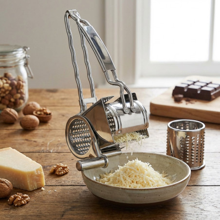 Este rallador de tambor giratorio con manivela que permite rallar sin necesidad de ejercer fuerza y evita riesgos de cortes cuando rallemos ingredientes pequeños. El rallador tiene 2 cilindros intercambiables para dos tipos de rallado, más fino o más grueso. Es perfecto para rallar quesos duros, chocolate y frutos secos. Y justo en el momento en que lo necesite: cada comensal puede rallar el queso sobre su plato de pasta, o chocolate sobre un postre, dosificándolo a su gusto. El rallador con 2 cuchillas está fabricado en acero inoxidable 18/10(aleación con 18% de cromo y 10% de níquel, que ofrece un alto nivel de calidad y resistencia superior al acero convencional). Ofrece una excelente resistencia a la corrosión y a los ácidos alimentarios y sales; es un material liso, no poroso y muy higiénico, fácil de limpiar, y no transmite sabores extraños a los alimentos. Las medidas del rallador con 2 cuchillas son 13.5 x 20 x 10 cm. Apto para lavavajillas.