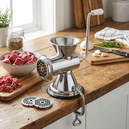Las picadoras de carne permiten obtener un tamaño homogéneo de los trozos de carne, lo que es difícil de conseguir con las cuchillas picadoras de las batidoras de vaso domésticas. Esta picadora de carne manual mantiene el diseño tradicional, compuesto de un eje espiral que al accionar la manivela empuja la carne hacia unas cuchillas giratorias que la pican y la expulsan a través de unos orificios. La picadora de carne manual incluye 3 discos para picar la carne más gruesa o fina y conseguir los mejores resultados para cada tipo de receta según el diámetro de sus orificios: 4, 5 u 8 mm. Está fabricada en acero inoxidable, material que ofrece una excelente resistencia a la corrosión y a los ácidos alimentarios y sales; es liso, no poroso y muy higiénico, fácil de limpiar, y no transmite sabores extraños a los alimentos. La picadora de carne manual cuenta con un sistema de sujeción en la base para dotarla de estabilidad. Sus dimensiones son 17 x 12 x 19 cm
