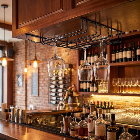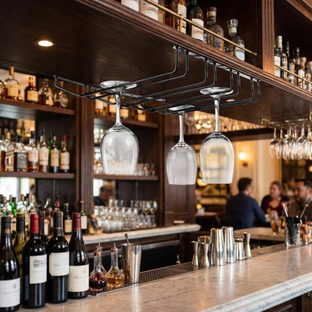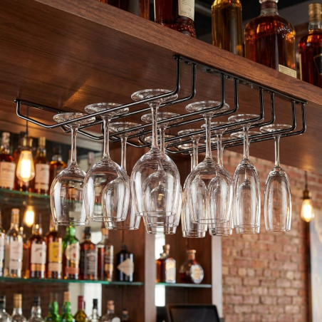 Fabricado en Acero Inoxidable. Ideal para bares y restaurantes. Acabado negro metalizado. Tamaño: 34 x 40 cm. 4 carriles. Atención: El diámetro de la base inferior de la copa debe ser inferior a Ø75 mm y el diámetro máximo de la copa no superior a 100 mm.