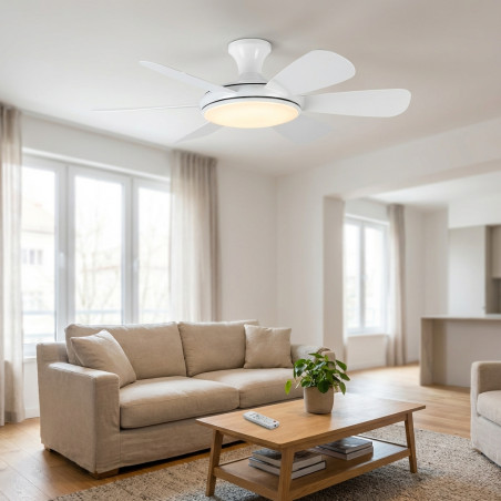 Ventilador de techo con luz LED regulable con una potencia de 32W y 2200 lúmenes. Incorpora tecnología LED SMD con temperatura de color ajustable en tres niveles: 3000K (cálida), 4500K (neutra) y 6500K (fría).