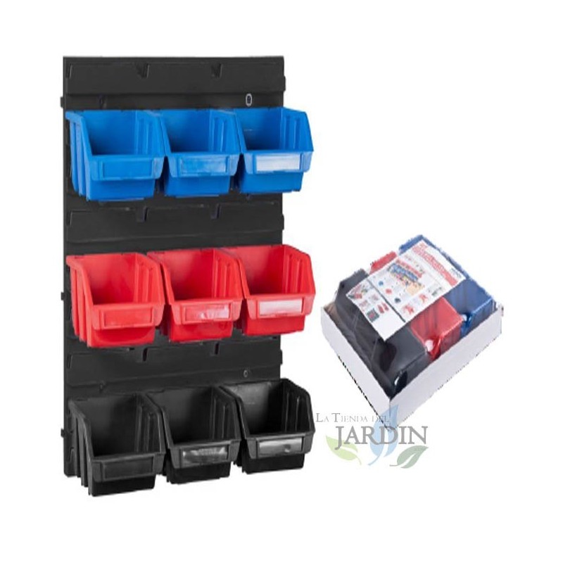 Pannello di lavoro con 9 cassetti Ideale per riporre piccole parti. Cassetti da 116 x 112 x 75 mm. - 3 rossi - 3 blu - 3 neri. Pannello 345x385 MM Prodotto in Spagna