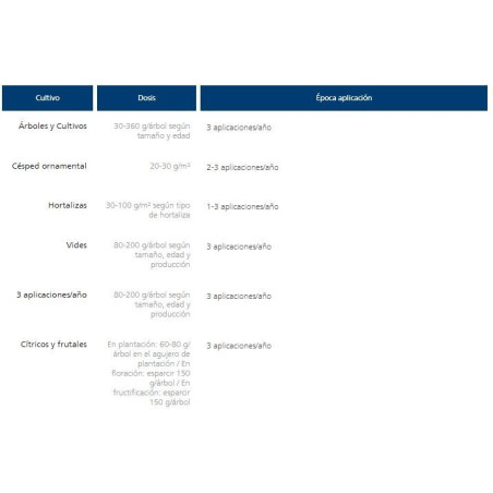 Contenu équilibré en azote : L'engrais complexe NPK a un contenu équilibré entre l'azote ammoniacal et uréique. Ces formes favorisent sa disponibilité pour la plante pendant beaucoup plus longtemps, garantissant un approvisionnement adéquat et continu pendant les périodes de plus grand besoin pour les plantes. Phosphore totalement assimilable : Le phosphore contenu est soluble dans l'eau à 95 %, et est totalement assimilable par les plantes. Le phosphore est un élément fondamental pour un développement racinaire correct des plantes, favorisant ainsi une meilleure utilisation de l'eau du sol ainsi que des autres éléments nutritifs, contribuant à une floraison abondante. Potassium : Le potassium de la gamme Blue Max est totalement soluble et assimilable par la plante. Le potassium dans les plantes est directement lié à une plus grande résistance aux gelées hivernales, aux périodes de sécheresse, aux coups de chaleur, aux ravageurs et aux maladies, améliorant ainsi la qualité et la production des récoltes. Avec du soufre : Le soufre ralentit le processus de nitrification, prolongeant ainsi le temps de libération de l'azote dans le sol. De plus, la synergie du soufre et du potassium favorise des plantes saines et robustes. Le soufre aide également les plantes à assimiler les microéléments présents dans le sol.