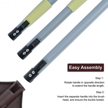 Cepillo con mango extensible para la limpieza y mantenimiento de césped artificial y alfombras. La entrada del rastrillo se puede ajustar de 68,5 CM / 26,9 pulgadas a 122 CM / 48 pulgadas girando el mango en la dirección opuesta, diseñado para la limpieza. Todo lo que tiene que hacer es insertar una manija separada en la cabeza. La tapa negra en la manija se instala firmemente para que caiga en el área de juego cuando se utiliza en el área de limpieza. Ideal para la limpieza de hojas, hierbas artificiales y pelo animal en alfombras.