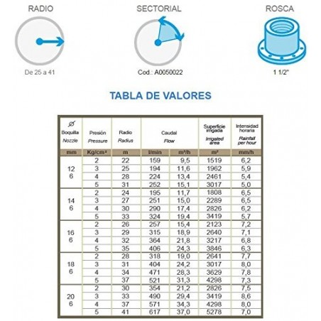 Portée de 22 à 41 mètres. Pression de service 2 à 5 bars. Raccordement 1 1/2 filetage femelle. Angle d'irrigation réglable. Permet l'irrigation à l'angle souhaité. Arroseur agricole en métal de haute qualité, caractérisé par sa dureté et sa durabilité. LaTiendadelJardin vous propose la plus large gamme de systèmes d'irrigation agricole du marché afin que vous puissiez toujours utiliser le modèle idéal qui correspond le mieux à vos besoins.