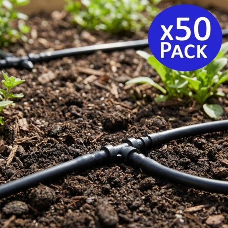 Raccord en T pour microtubes de 4 mm . Accessoire pour l'irrigation goutte à goutte. Permet de raccorder des microtubes de 4,5 x 6,5 mm. Noir. Haute qualité. Conditionné en sachet de 50 unités.