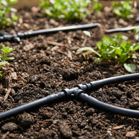 Raccord en T pour microtubes de 4,5 mm. Raccord pour irrigation goutte à goutte. Permet de connecter des microtubes de 4,5 x 6,5 mm. Noir. Haute qualité. Conditionné en sachet de 200 unités.