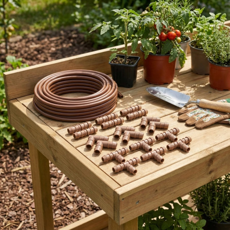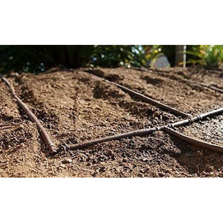 Pack d'irrigation goutte à goutte de 16 mm composé de 6 tés goutte à goutte, 6 coudes goutte à goutte, 6 liens goutte à goutte. Couleur marron. Utilisé dans le jardinage et l'agriculture. Marque Suinga.