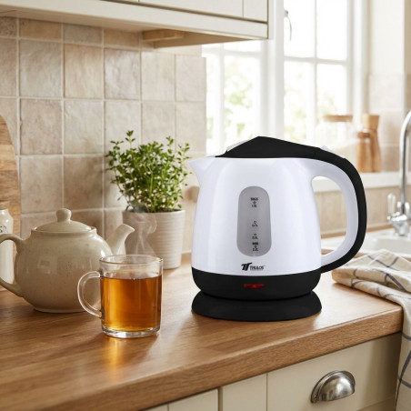 Bouilloire électrique d'un litre en acier inoxydable avec filtre amovible. Idéale pour les thés et les infusions, elle est dotée d'un arrêt automatique et d'un format portable pour une utilisation polyvalente et sûre à la maison comme au bureau.