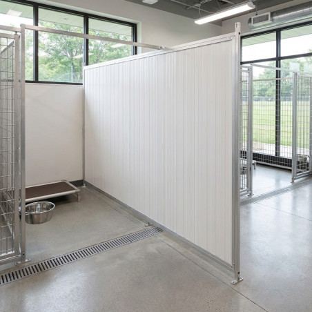 Panneau latéral de séparation robuste de type sandwich (200 x 185 cm) pour optimiser le compartimentage et la sécurité des niches pour chiens. Matériau durable, hygiénique et facile à nettoyer, idéal pour les installations professionnelles.